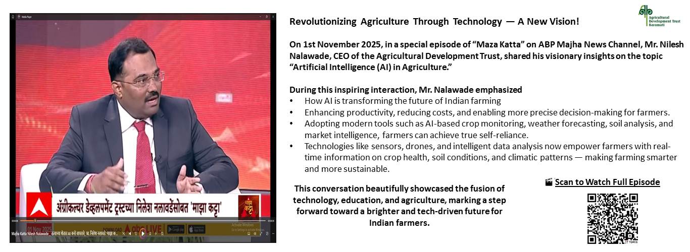 Established in 1971, the Agricultural Development Trust, Baramati, is dedicated to transforming rural lives through sustainable agriculture, quality education, and community empowerment. From pioneering water conservation and modern farming practices to building one of India’s leading women’s education campuses, the Trust has become a model of integrated rural development. Embracing innovation, technology, and global collaboration, it works across sectors like agri-tech, healthcare, skill development, and entrepreneurship. With a mission rooted in sustainability, inclusivity, and progress, the Trust continues to uplift farming communities, promote climate-smart practices, and create lasting impact across Maharashtra and beyond.
